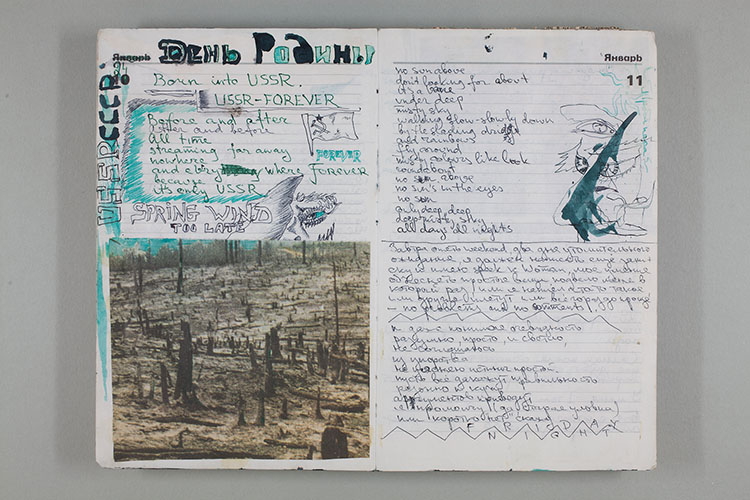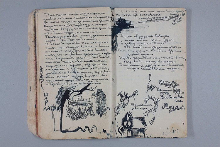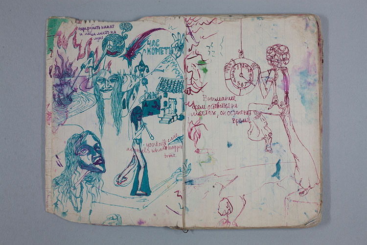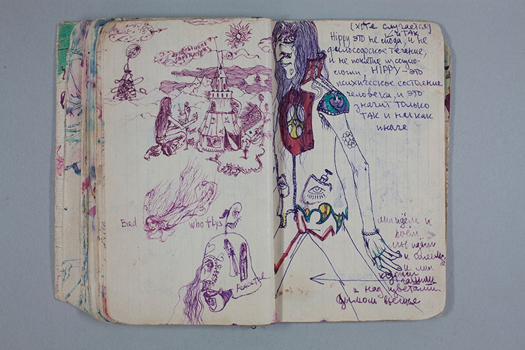 At the end of the interview, Azazello showed me a little notebook he had brought along. It was a particularly fine example of his drawings from 1977. He told me that he had many more. I was intrigued, indeed excited, since written sources are few and far between in the Soviet hippie world. We agreed to meet again and look through the notebooks. Alas, this 2011 meeting was to be my only encounter with him in person. I got in touch with him the following year, when I spent some time in Moscow during the freezing, early days of 2013. Instead of him, I got Julia on the phone. She had decided that there might be money in the endeavour. I had no money to give. There is no funding for bribes in academic budgets. In the end, we decided to meet at the Dynamo metro station to exchange notebooks for a pair of boots. Julia screamed and was agitated on the phone. I waited at Dynamo for an hour and a bit. The wind piped through the station and it was minus 25 on the street. I was just about to give up when Julia emerged from a train. She had taken some uppers and was jittery and aggressive. I had to go to the other end of Moscow with her. She did not have any notebooks. She wanted to know where the boots were. I decided to abandon the deal. I was a bit scared of this hyper and hyped-up person yelling at me. I didn’t want to go to the other side of Moscow to some flat in a high-rise which might or might not contain notebooks. I went home and told myself that research is not everything. Half a year later, I was pregnant with my second daughter. Russia was far away, since we had moved to New York. One day I received a message with no words in it. It was from Azazello. I called him back. He answered, he was charming, he told me that he loved me, and that Julia was jealous because somebody with the same name had shown up. I told him that his notebooks were valuable, that he should save them, that I would like to put them into an archive. He agreed. In the following year, I started working with the Wende Museum, arranging the transfer, sale, and donation of hippie archives. Via Irina Gordeeva in Moscow, I got back in touch with Azazello. He trusted her schoolmistress-like manner and the miracle happened: despite his chaotic life, despite his failure to answer his phone most of the time, despite him blowing off meeting after meeting, in the summer of 2014 his archive made its way to California in another scholar’s luggage. It smelled of smoke and hash and the hippie life. I received it on a terrace in the LA neighbourhood of Venice. I started to read the poems. I leafed through the notebooks. I looked at the pictures and photos. I saw a life. A creative life. A really interesting piece of history. I decided then and there to apply for money to make something out of this archive. To let the Azazello’s world come out of the shadows and small dingy apartments where it had been hiding itself.