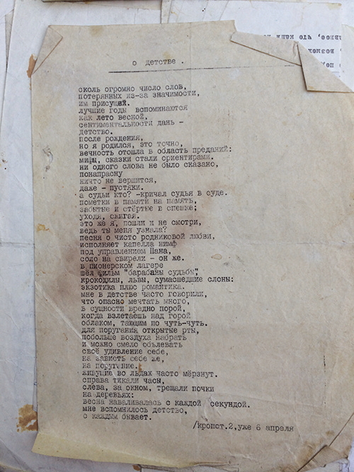 It was a day in March—I have a very good memory for dates. It was the twelfth or thirteenth of March in ‘76. I worked at the Surikov Institute. And she did too. And she came from work. And I went to work. Life seemed tough at the time. Cold. Spring was held up. I came up the stairs and she was about to go down. And I thought that this was some kind of omen. I had no flat at the time where I could spend the night. And she said, “Hello, hello, how are things?” And I tell her that not everything is great [v kaif]. And she says, “If you want to, come to me this evening.” And she bites into an apple and passes it on to me. I don’t have a clear thought in my head and simply say, “Ok.” And when she is going down the stairs, I call after her, “Give me a fiver.” I had no money at all.[19]