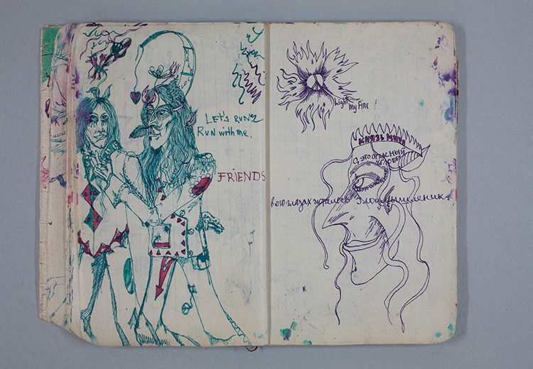 A closer look at the dense contents of the notebooks – which were made up of a variety of media, including poems, song lyrics, drawings, phone numbers, philosophical deliberations, newspaper cuttings, and even artwork created out of bloodstains – indicates three main concerns for Azazello at the time—or better, three areas where he felt he expressed himself. First, almost certainly under Ofelia’s influence, he tried to define what it means to be a hippie. This attempt at individual and collective self-definition found its expression in the aforementioned fairy tales, but also in more overt explanations such as manifestos and poems directly invoking hippie practices and characteristics. On top of this, almost all of the drawings make references to hippie insignia or idealized versions of hippiedom. Tightly intertwined and inseparable from this first concern was the matter of narcotics, which were seen as integral to hippie existence. Their effect fostered, and was reflected in, the numerous drawings and most of the writing. Finally, a strong love for music is evident in the notebooks, which are filled with references to particular songs and groups. The implication is that music and its “feel” joined drugs in creating what Soviet hippies called “kaif”—that feeling of elevation, knowledge, contentment, and adventure that hippies chased using various methods. Kaif was what united all three areas of Azazello’s creativity.