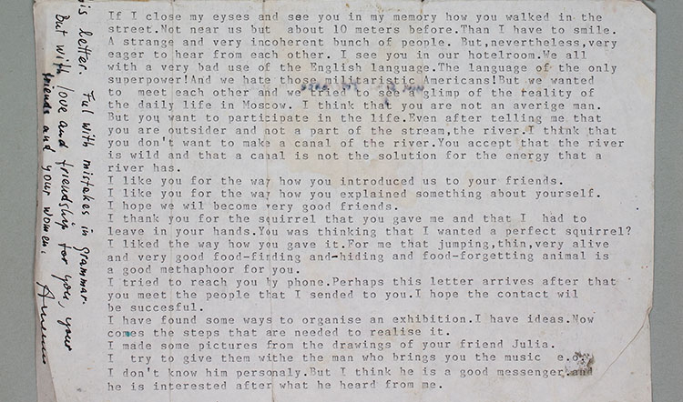 In that fateful year of 1991, the officially organized Conference of the Defenders of Peace brought a glut of foreigners to Moscow, among them the Dutch peace activist Annemie Ummels. Despite the fact that Azazello had only fleeting contact with her for about a week, she left quite an impression on him—and vice versa. She seemed to have impressed on him the need to get rid of his drug addiction. But more importantly, in Ummels he encountered someone who argued as passionately about politics as he did. Most of his hippie friends had no interest in political activism or actively shunned it. Azazello was never in this category, even if he did not follow his friend Diversant in restless agitating or some of his hippie friends in joining up with dissidents. We can locate Azazello’s political mind a bit through Ummels’s testimony. In an interview in 2020, she remembered that he scolded her and her friends for being so naïve as to accept an invitation from Soviet officials. She in turn tried to make him understand that power structures and militarization in the East and the West were not so different. It is the classical gap between the seasoned Soviet nonconformist who has no love left for the Soviet state and the principled Western leftist who condemns Soviet oppression but cannot quite let go of the idea that somehow lived socialism must be better than lived capitalism. According to Ummels, at the time Azazello was periodically sleeping in a large house with Afghan veterans and other hippies, including Faif and Julia. This might be what later became the Bulgakov Museum on the Garden Ring in Moscow, which in the early 1990s was a well-known hippie squat, immortalized in Artur Aristakisian’s provocative film, Mesto na zemle (2001). Ummels describes the space as a very underground, very bohemian, and very arty place, where projectors painted images on the wall and people displayed their art. In her letter to Azazello, Ummels recalls that he gave her a squirrel as a gift, which she left in his possession—hence the letter is addressed to Azazello and the squirrel. She also recounts in detail how she perceived him, being very reflective about her own position as an old ‘68er in search of the authentic Soviet Union—the ordinary people who correspond to her own position vis-à-vis her own society.